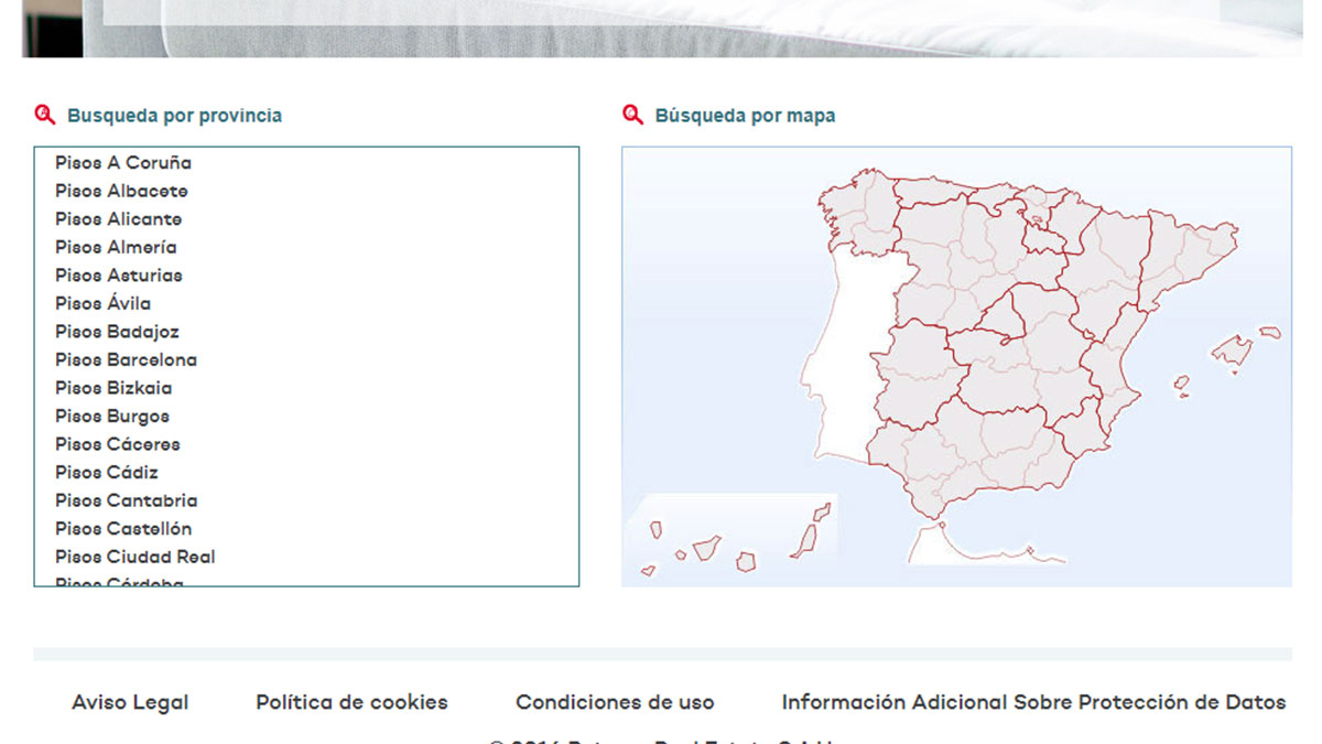 Otra opción, si solo quieres acceder al catálogo de viviendas disponibles en una zona concreta, es buscar a través del mapa o del listado de provincias que aparece en la parte inferior de la página principal.
