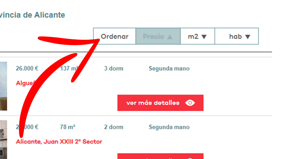 Además de en este lateral, puedes ordenar la forma en la que se muestran los resultados con el menú superior. De esta manera, puedes ver los más baratos primero o viceversa. Incluso ordenarlos por superficie en metros cuadrados o por número de habitaciones.