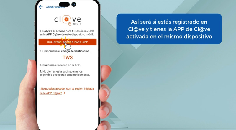 Para usar este método de registro, es imprescindible tener la app de Cl@ve instalada y estar registrado en la misma. Si es así, solo tendrás que seguir los pasos que aparezcan en pantalla tras la redirección a la aplicación de Cl@ve.