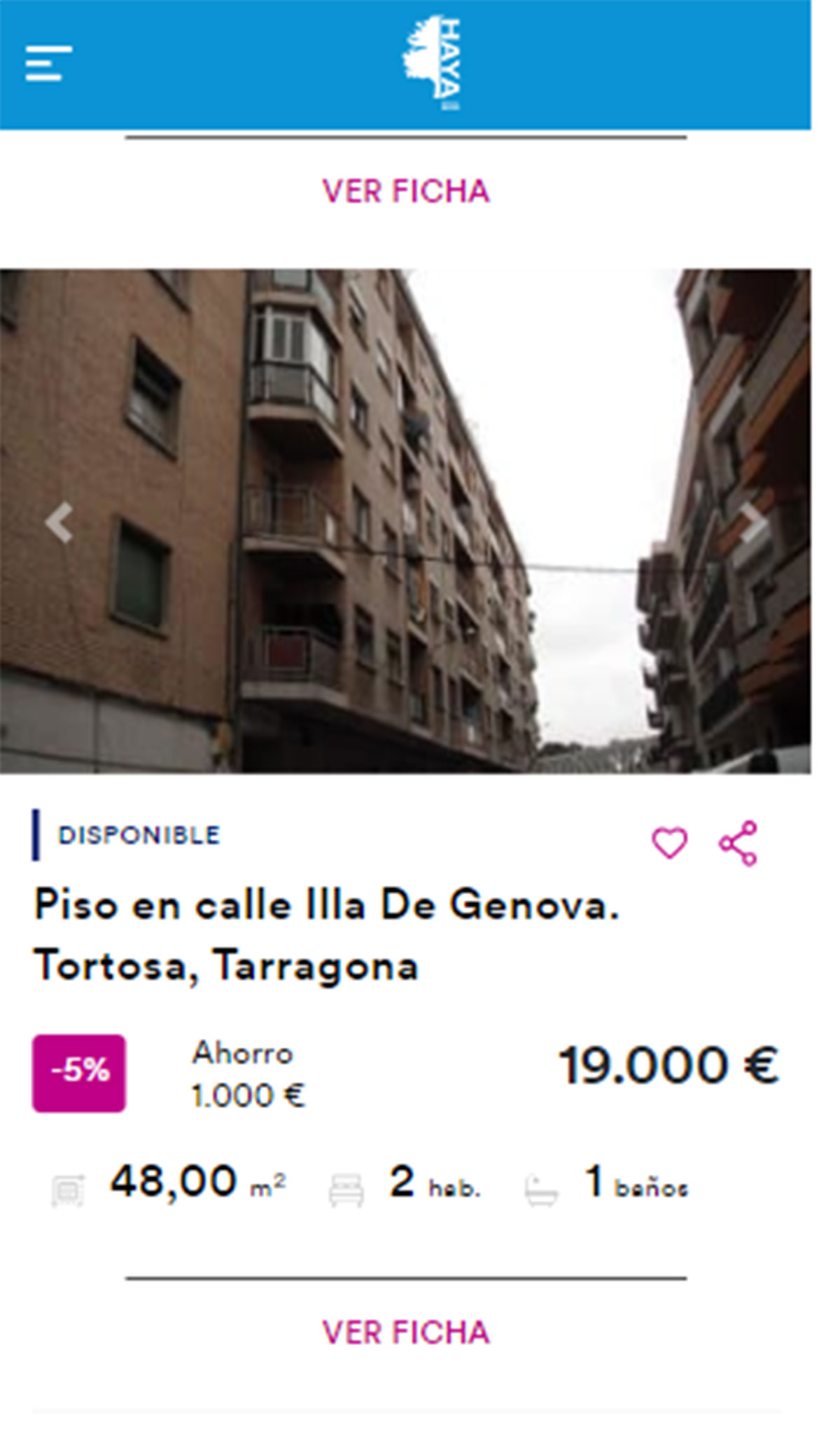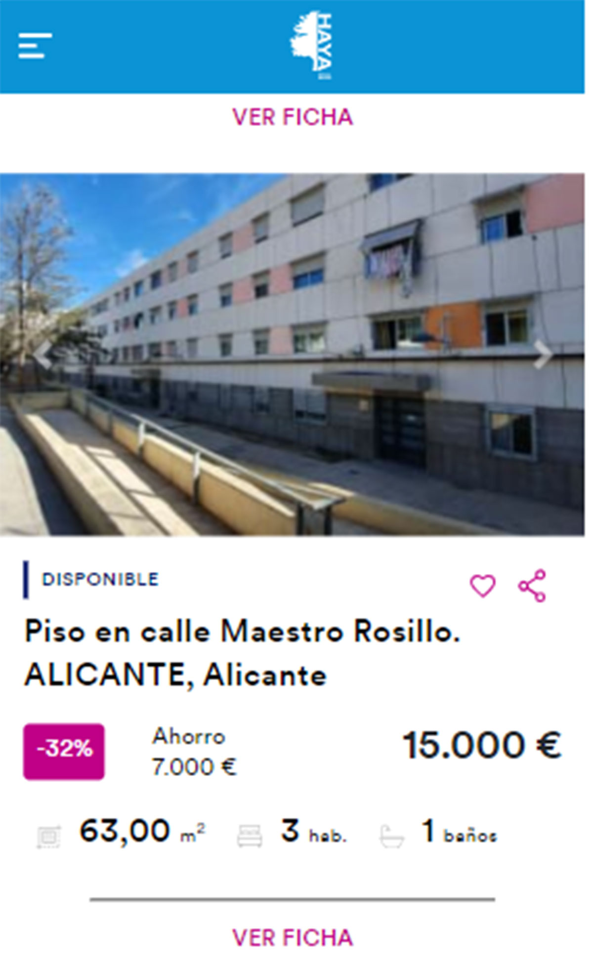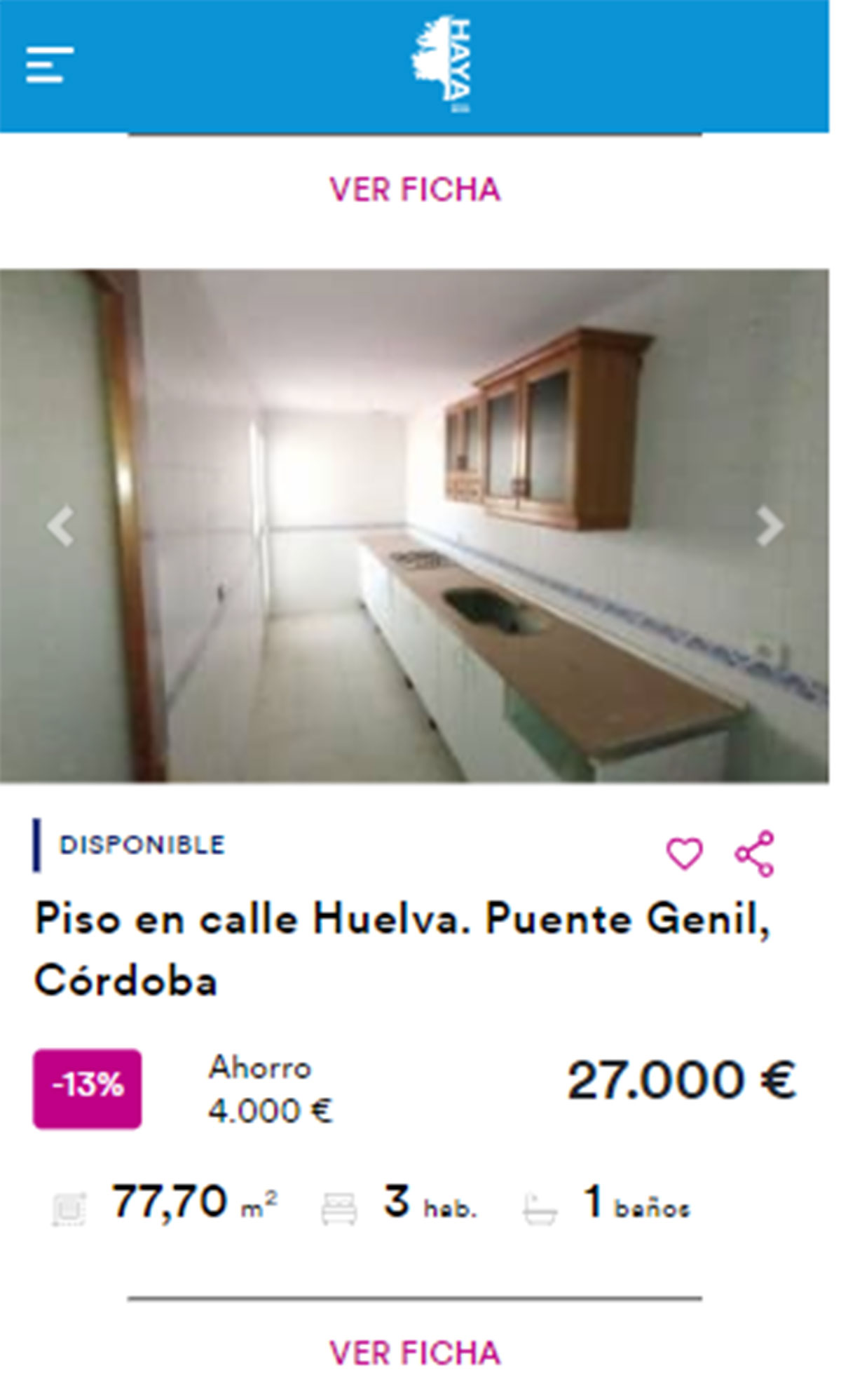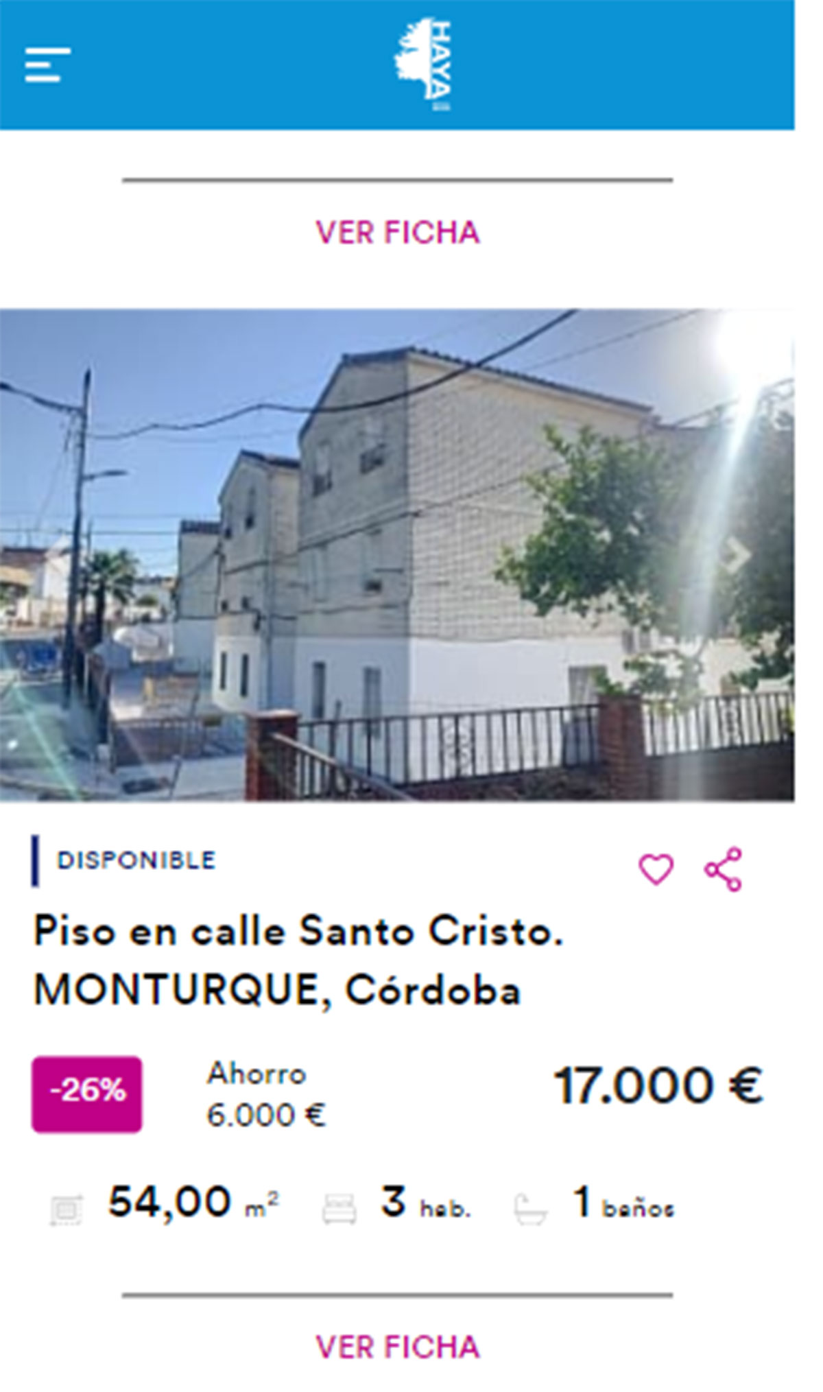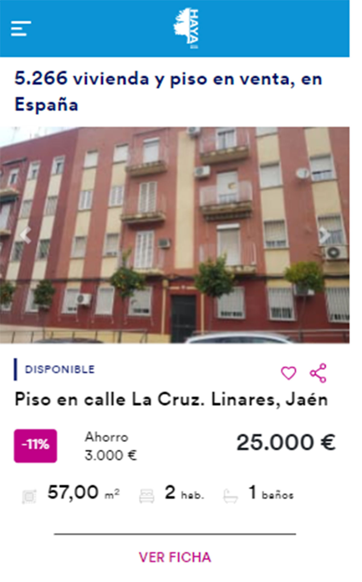 Del total del catálogo de pisos en oferta disponibles en Haya Inmobiliaria, algunos de los más baratos pueden comprarse desde 11.400 euros. A continuación puedes ver una selección de las viviendas con descuento disponibles con los precios más bajos:
