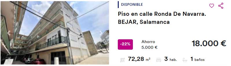 Por 18.000 euros se vende este piso en Béjar (Salamanca). El inmueble tiene 72,28 metros cuadrados de superficie total construida en un edificio de cinco plantas sin ascensor. La distribución consta de salón-comedor, cocina amueblada, tres dormitorios y un cuarto de baño.