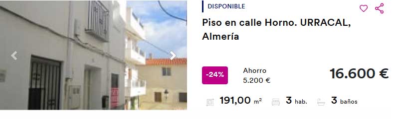 En Urrácal (Almería) se vende este piso por 16.600 euros. Se trata de una vivienda unifamiliar con tres plantas y una superficie construida de 191 m². La distribución consta de un sótano, una planta primera destinada a almacén y tres dormitorios, tres baños, cocina, comedor-salón.
