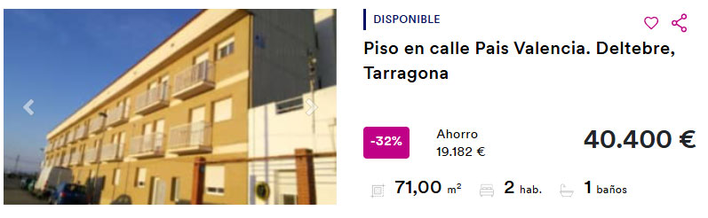 El portal Haya Inmobiliaria está vendiendo cientos de pisos de banco procedentes de la entidad Cajamar. En su catálogo de vivienda dispone de pisos entre 27.000 y 73.000 euros, en diferentes puntos de la geografía española y todos con una característica en común: están listos para entrar a vivir desde ya y no necesitan prácticamente reformas.
