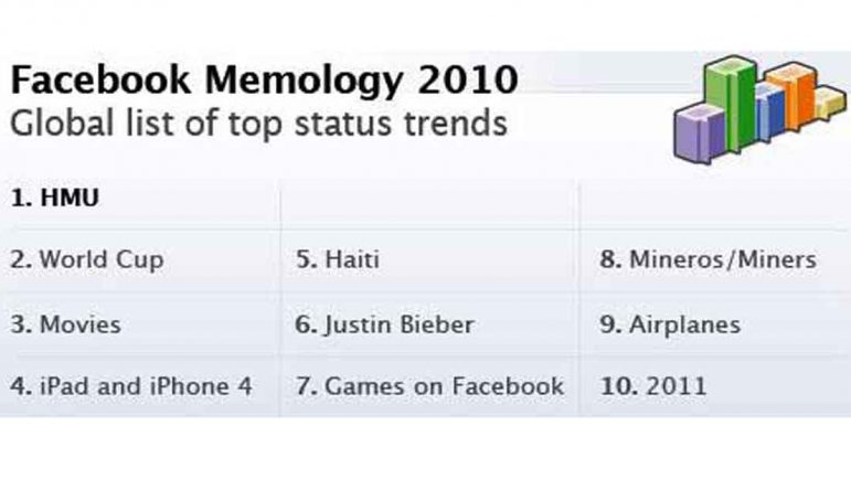 El perfil de estado en Facebook es esa barra blanca donde aparece, a estas alturas, cualquier cosa, ya sea un estado de ánimo, una acción, un propósito, un deseo, una… Pues bien, a nivel mundial, el término que más se usa es el acrónimo HMU (significa ‘Hit me up’ o, lo que en español se traduciría por ‘dame un toque’). Este es el estatus más repetido por los usuarios de Facebook durante 2010. La red social Facebook acaba de publicar su segundo estudio ‘Facebook Memology’ que viene a analizar los términos que más han crecido en entre sus más de 500 millones de usuarios. El motivo de su creciente uso ha sido después de este verano, cuando los usuarios empezaron a usarlo de forma masiva con el fin de que sus amigos contactaran con ellos para salir.