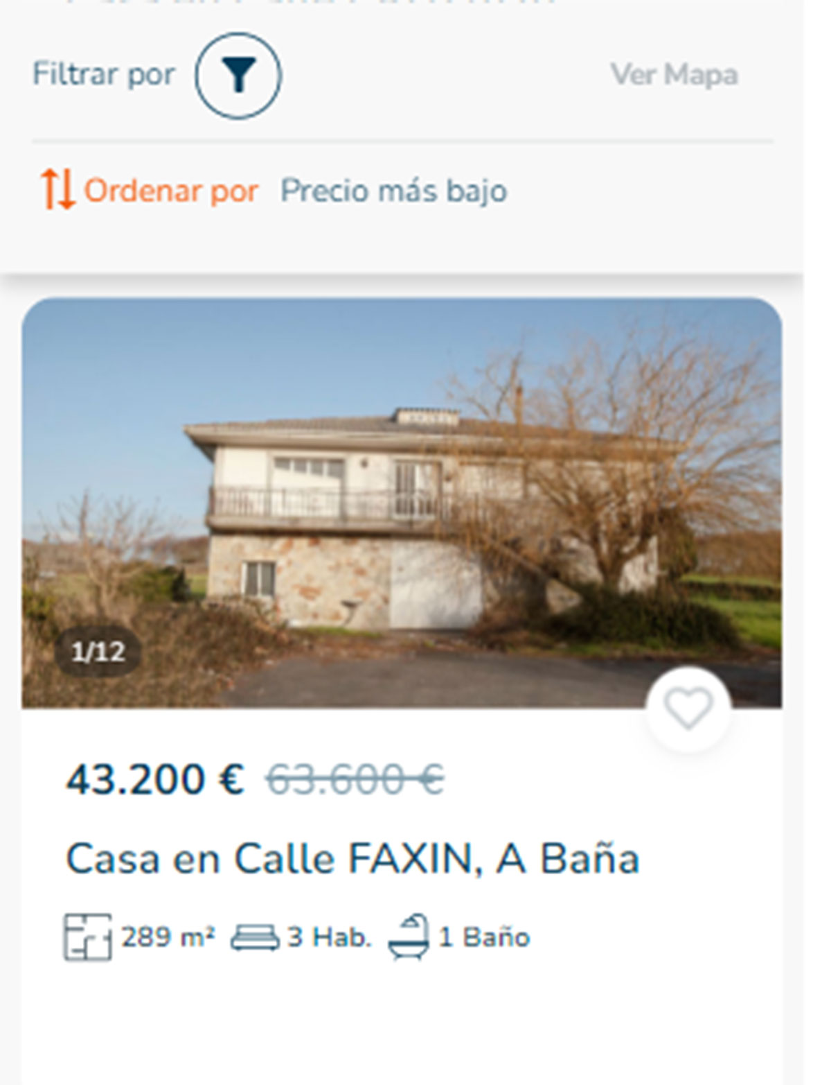 Casa en venta por 42.3000 euros en A Baña. Es una vivienda de tres habitaciones y un baño en 289 metros cuadrados.