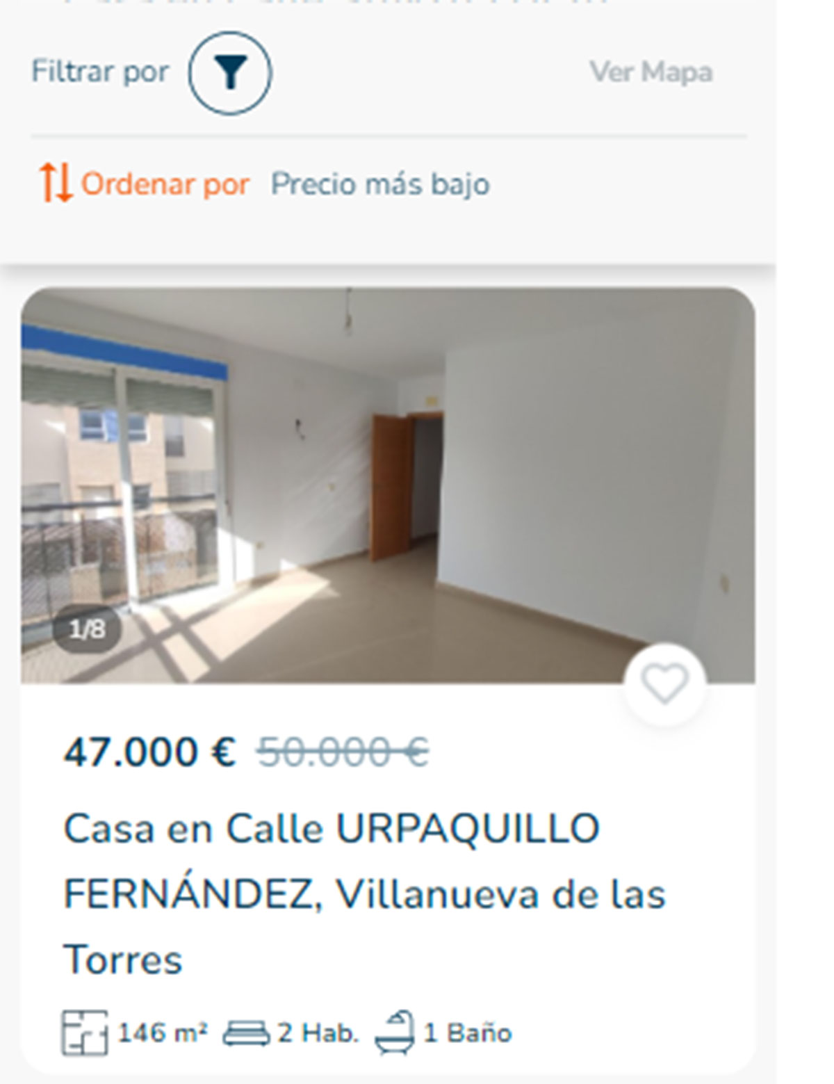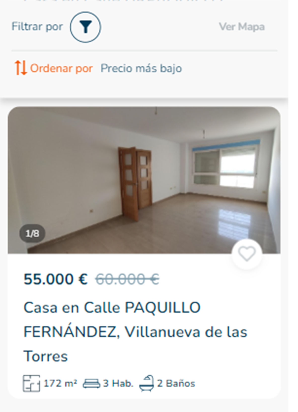 Casa en venta por 55.000 eros en Villanueva de las Torres. Tiene 172 metros cuadrados con tres habitaciones y dos baños.