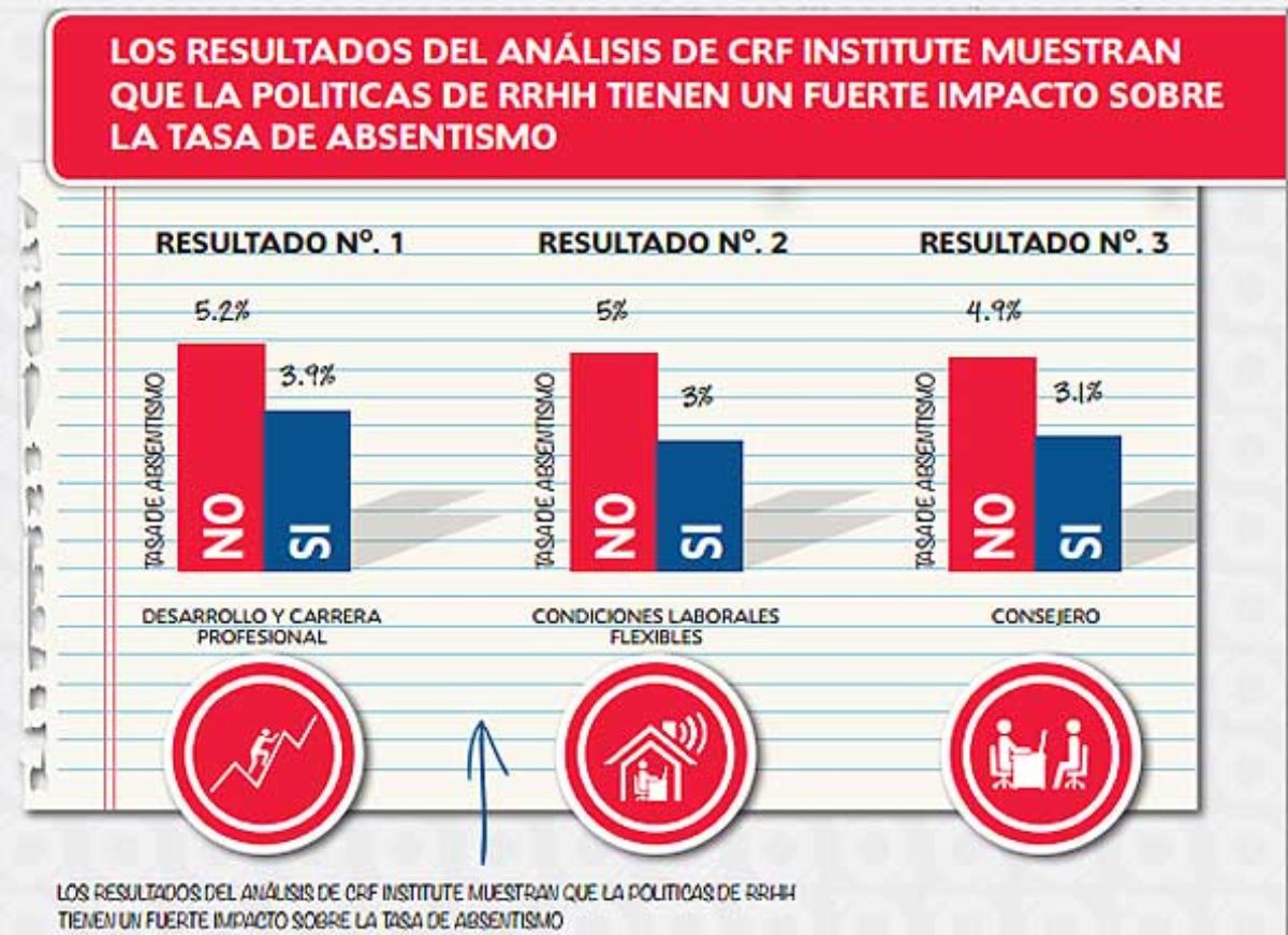 Las empresas que ofrecen la posibilidad del teletrabajo tienen una tasa de absentismo del 3 % frente al 5 % de las que no desarrollan esta práctica, según los datos de CRF Institute; además, las organizaciones en las que el desarrollo de carrera es una de las cinco principales prioridades del negocio tienen una tasa de absentismo del 3,9 % frente al 5,2 % de las que no le conceden esta importancia, y las compañías en las que los profesionales disfrutan de counselling (asesoramiento) de apoyo para la conciliación disfrutan de una tasa de absentismo del 3,1 % frente al 4,9 % de las que no han implantado estas acciones.