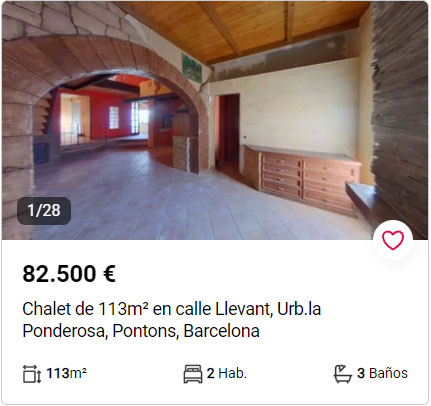En la Urbanización la Ponderosa de Pontons (Barcelona), se vende este chalet por 82.500 euros. El inmueble tiene 113 metros cuadrados y se distribuye en dos habitaciones, salón-comedor, cocina y tres baños. Tiene tanto jardín como piscina en la parcela.