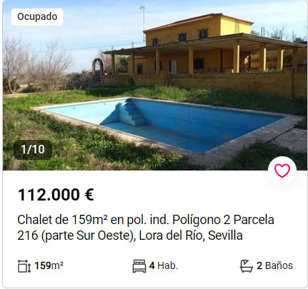 Por 112.000 euros, se vende este chalet en Lora del Río (Sevilla). El inmueble se encuentra actualmente ocupado por terceros y es imposible visitarlo por dentro, pero es una buena oportunidad de inversión.