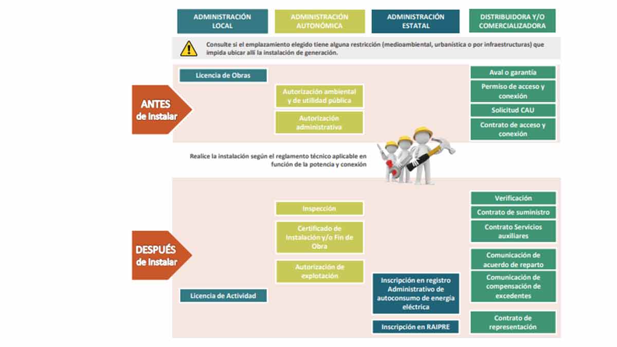Lo primero que tienes que saber es que conectar las placas solares a la red eléctrica es un proceso largo lleno de trámites burocráticos. En estos casos tienes que solicitar documentación en los tres niveles de administraciones: local, autonómico y estatal, tal y como aparece reflejado en la ‘Guía profesional de tramitación del autoconsumo‘ del Instituto para la Diversificación y Ahorro de la Energía (IDAE). Los trámites en estas tres administraciones se completan con los que hay que pedir a la empresa distribuidora. A rasgos generales, antes de comenzar la obra para conectarte a la red tienes que conseguir estos documentos: