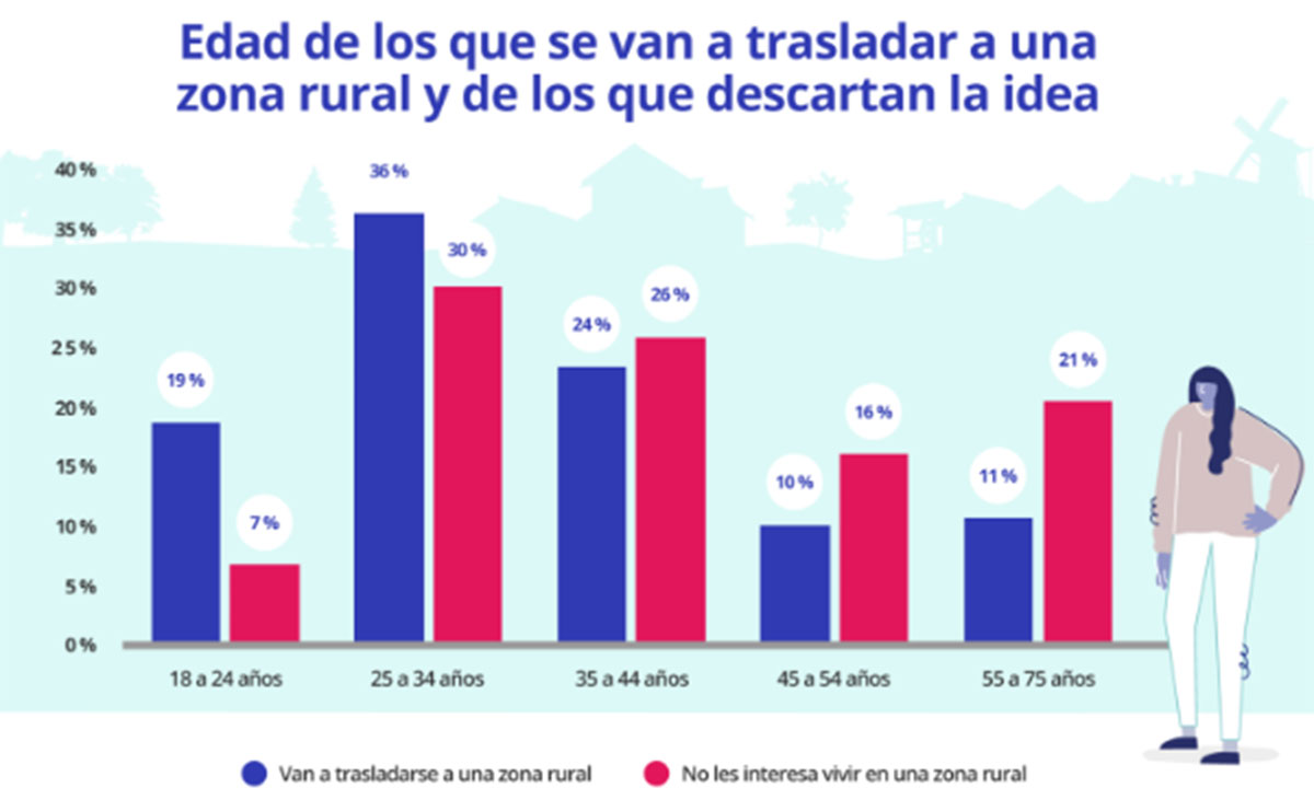 En cuanto a los distintos rangos de edad, el grupo con más intenciones de irse a un pueblo es el que se corresponde con jóvenes de entre 25 y 34 años, donde un 36 % de los encuestados lo afirma. Aunque este dato contrasta fuertemente con que, en el otro extremo, el 30 % de los jóvenes de esa edad no les interesa vivir en un pueblo.