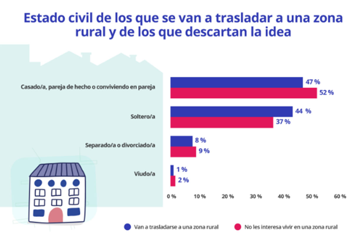 Casados, parejas de hecho, novios y solteros. Estos son los principales grupos de personas que tienen intenciones de irse a un pueblo. Aunque el estado civil predominante es el de casado, pareja de hecho o que convive con una pareja en el 47 % de los casos, la cifra baja ligeramente desde el año pasado, cuando se situaba en el 56 %.