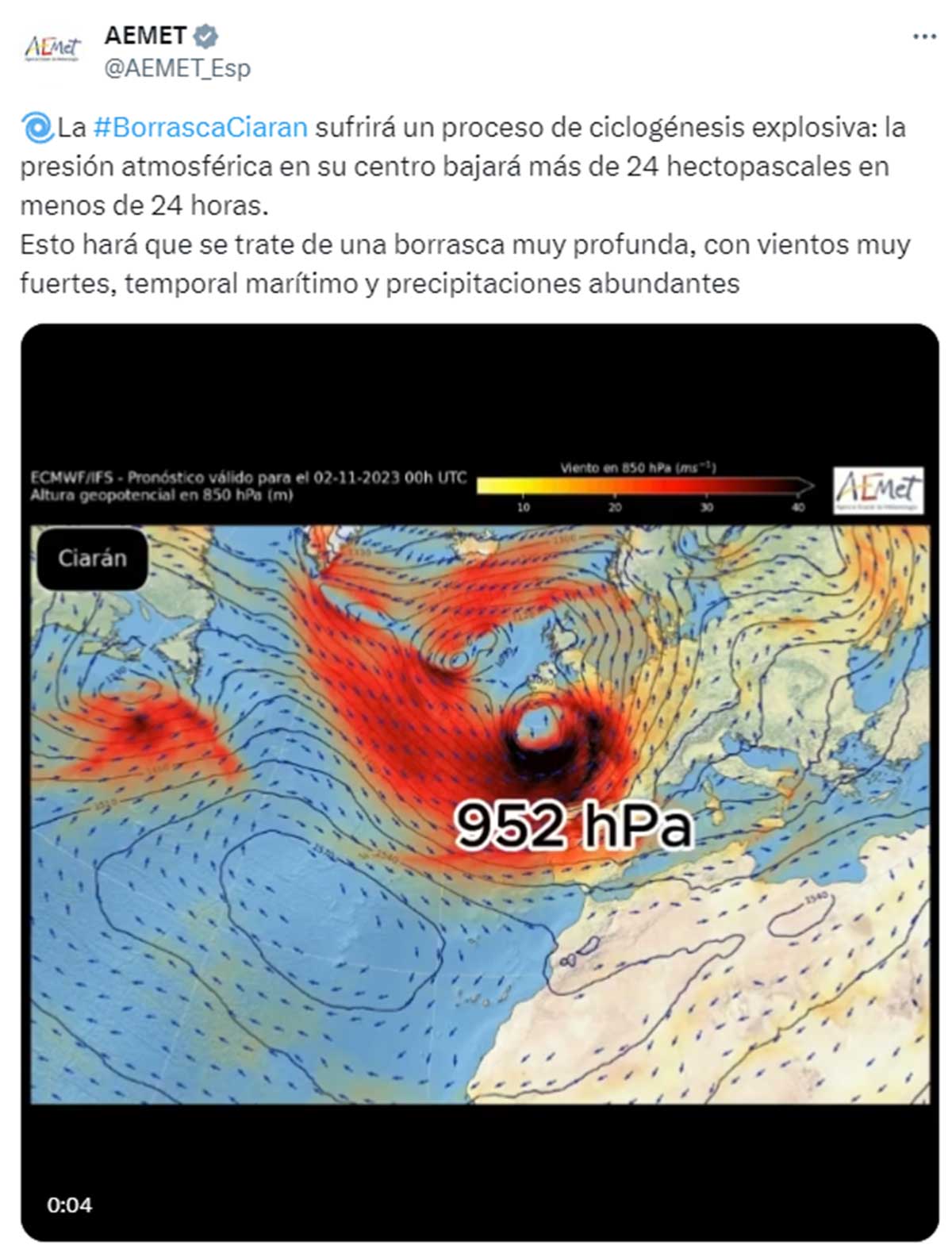 La Agencia Estatal de Meteorología (AEMET) ha emitido un comunicado de última hora por la presencia de la borrasca Ciarán para el puente de Todos los Santos. La nueva borrasca profunda y de alto impacto sufrirá un proceso de ciclogénesis explosiva. Se espera que tanto en la Península como en Baleares haya un temporal de vientos muy intensos, precipitaciones generalizadas y nieve en las montañas.