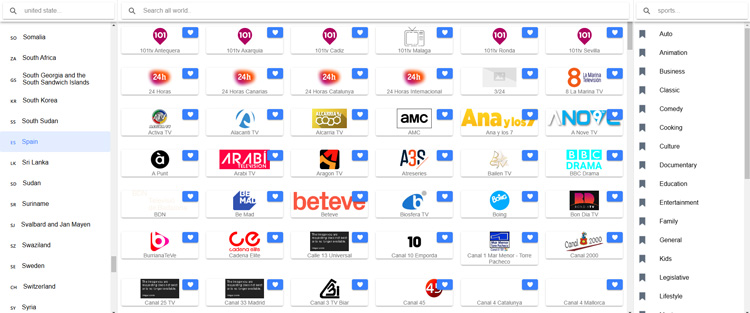 Por ejemplo, puedes seleccionar la categoría de deportes para ver una lista, ordenada alfabéticamente, con todos los canales deportivos gratuitos del mundo.