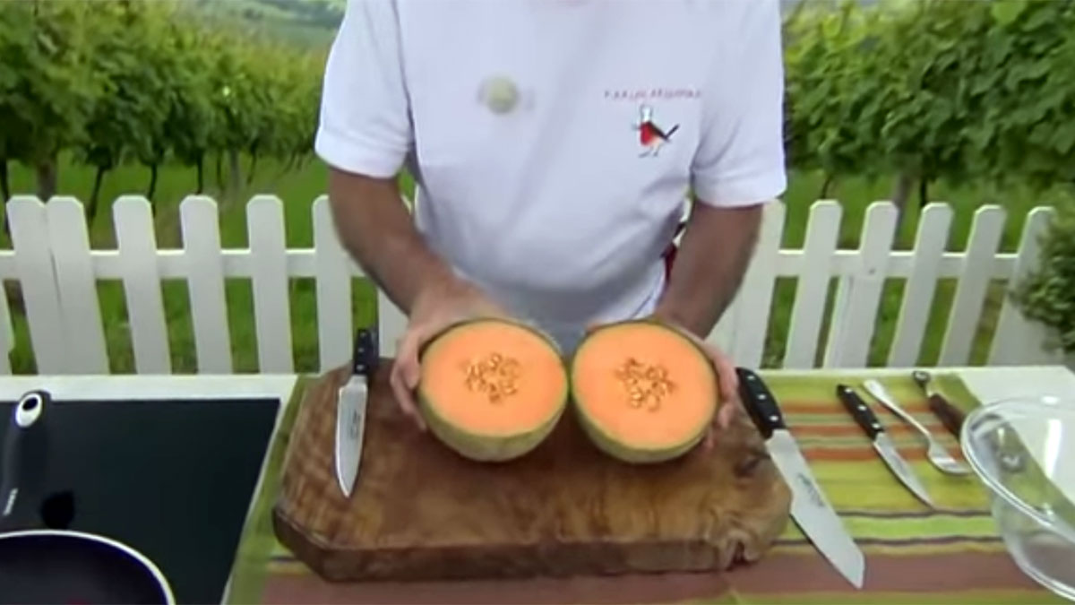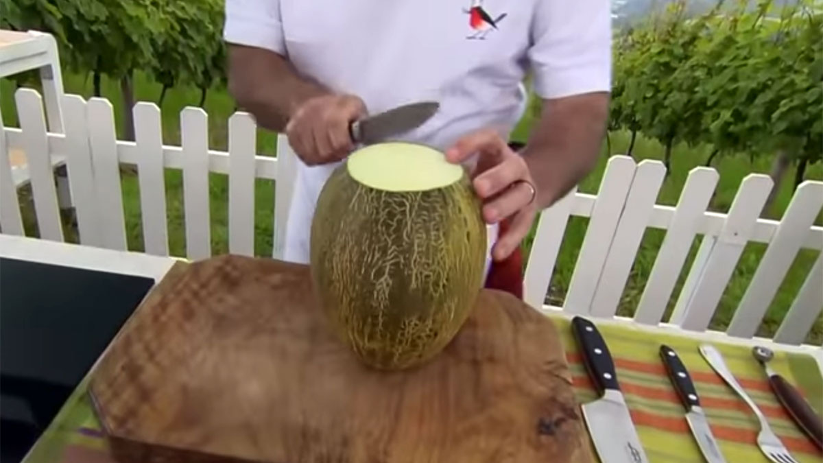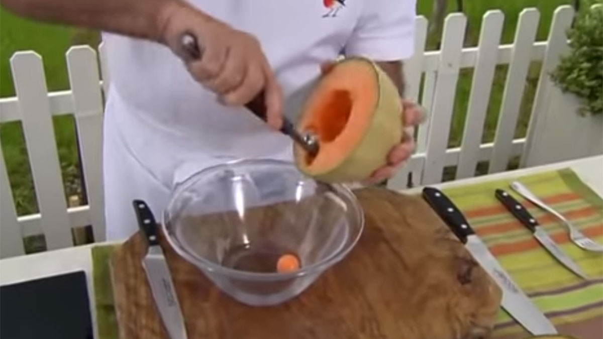 - Este melón no va a triturarse, sino que sirve como toque especial de sabor y de decoración. Por ello, Arguiñano en la elaboración coge una de las mitades, la limpia de las pepitas y coge un utensilio de cocina con cabezal redondo para sacar bolas de melón.