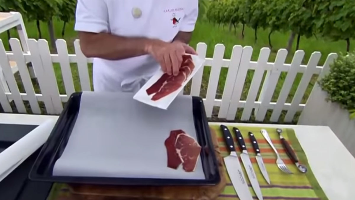 - El primer paso de esta receta es poner el horno a precalentar a 180 grados porque la primera elaboración de esta sopa es hacer el crujiente de jamón. Para ello, coge un par de papeles de horno y coloca el primero en la bandeja. A continuación, coloca las cuatro lonchas de jamón encima. Y, para terminar, coloca el otro papel encima de las lonchas de jamón. Para que el crujiente salga de diez, Arguiñano aprieta el papel y pasa la mano por encima con un poco de presión para que se queden las tres capas (papel y jamón) lo más juntas posible. Hecho esto, introduce la bandeja en el horno y lo deja durante 10 o 12 minutos para que se haga bien.