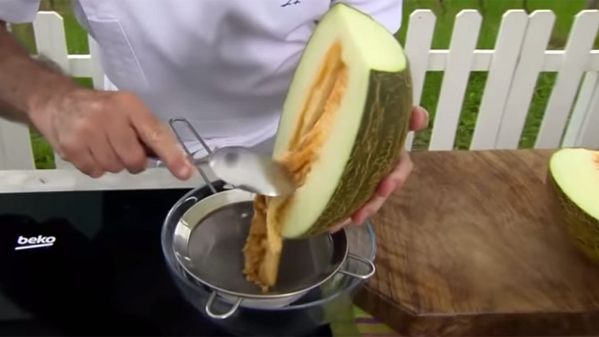 - Con las dos mitades encima de la tabla bocarriba, el siguiente paso es quitar las pepitas de la fruta. Pero ojo, porque no las tira, sino que las introduce en un colador con un recipiente de cristal debajo para no perder el jugo del melón.