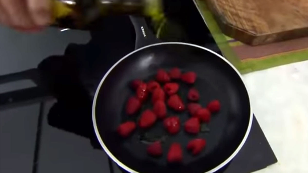 - Durante este tiempo en el que el melón triturado se enfría, hay que coger las frambuesas y cocinarlas. En concreto, hay que echarlas a la sartén y poner un poco de aceite de oliva para saltearlas. El fuego no debe estar muy fuerte para que, mientras se cocinan, aprovechar y cortar el melón de cantaloup.