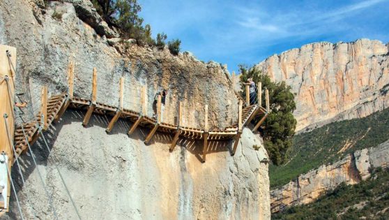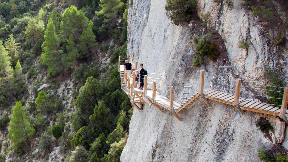 La ruta de las Pasarelas de Montfalcó es una de las más espectaculares de la provincia de Huesca. Toda una aventura para los amantes de la adrenalina y de las alturas, puesto que el recorrido discurre por una serie de pasarelas y escaleras que están directamente enclavadas en una gran pared de roca. Durante el camino, el visitante puede atravesar puentes colgantes y un desfiladeros de gran envergadura.
