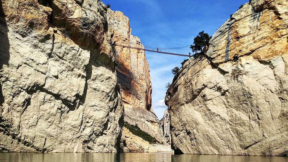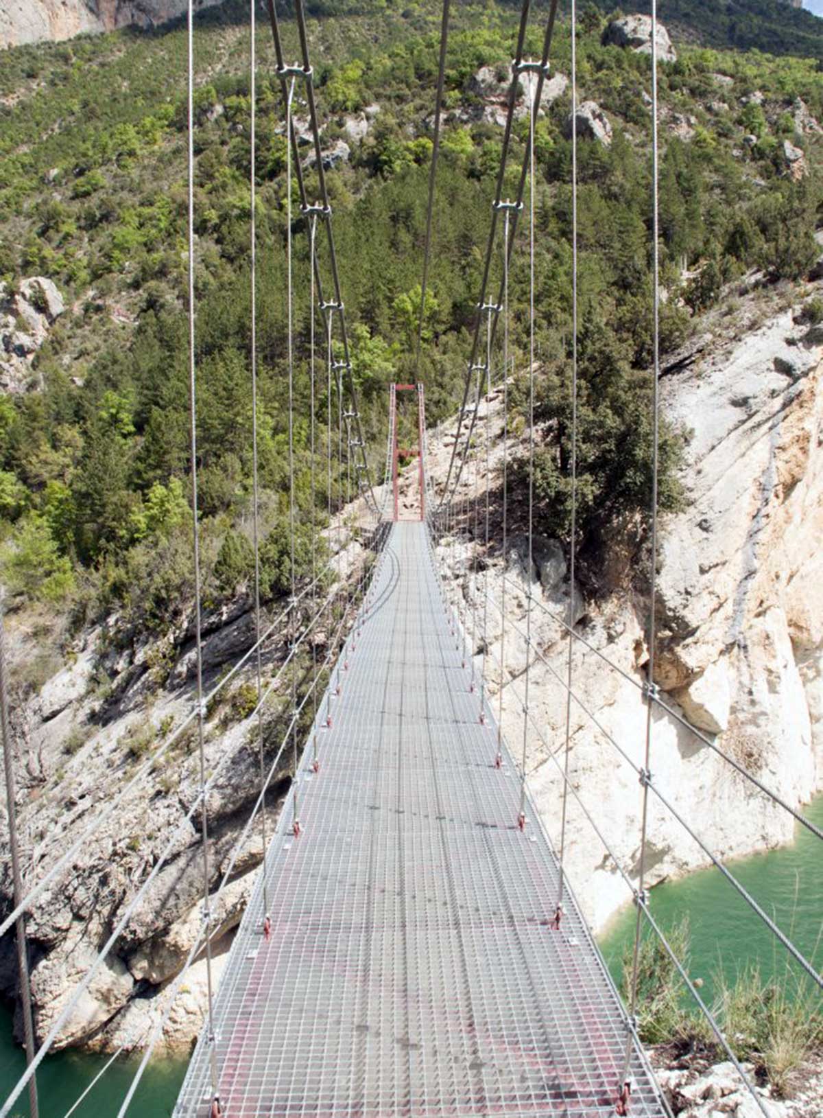 Superado el tramo, el camino continúa por una pendiente pronunciada con unos talones de madera que facilitan el trayecto. El visitante llega a continuación hasta el puente colgante que tiene que cruzar para empezar la subida por una senda que culmina en el Congost de Mont Rebei.