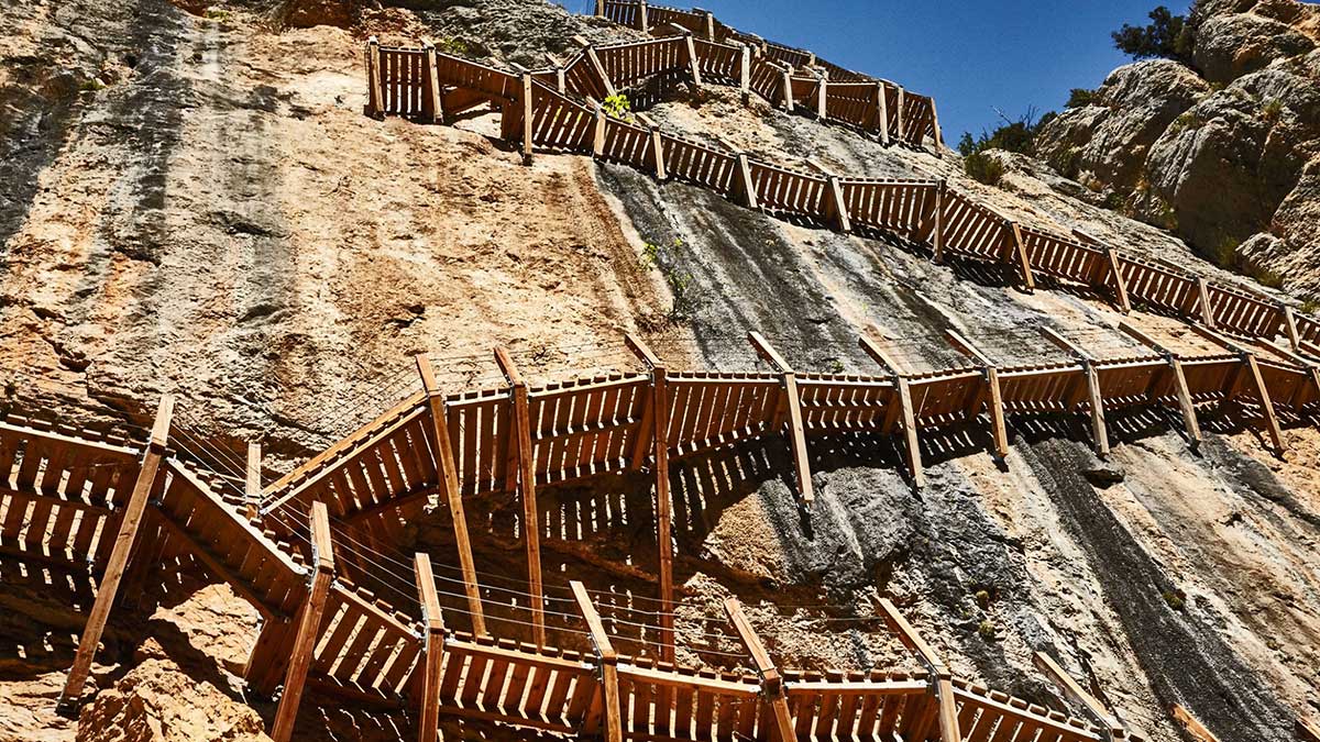 En esta primera subida de escalones el senderista salva un total de 33 metros de desnivel a través de las rocas y mediante un recorrido en zigzag por pasarelas y escaleras estrechas.