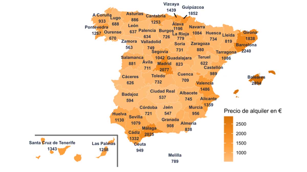A nivel provincial, Madrid, Barcelona, Baleares o Málaga son las provincias con un precio más elevado, con un precio de alquiler mensual de 2.077 euros, 2.240 euros, 2.894 euros y 2.025 euros respectivamente. En el lado contrario, las provincias más económicas son Ciudad Real (537 euros) o Zamora (563 euros).