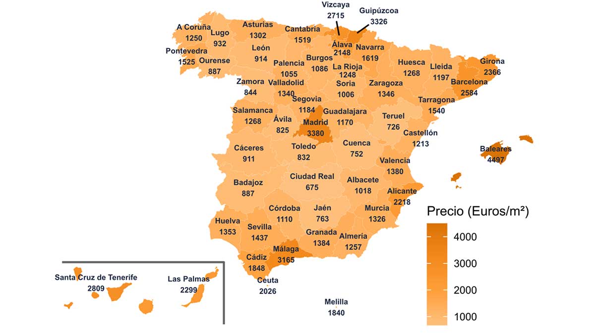 Baleares, con un precio unitario medio de 4.497 euros/m², se sitúa como la comunidad más cara, seguido de Madrid y País Vasco, con 3.380 euros/m² y 2.804 euros/m², respectivamente.