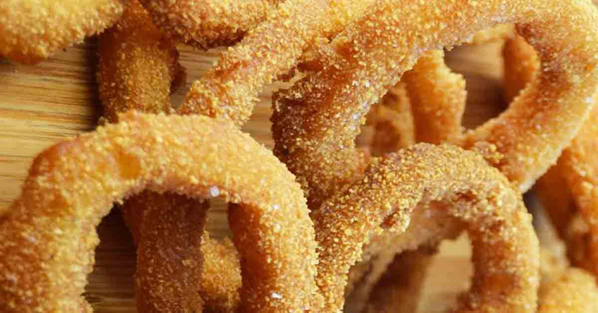 - Para hacer los aros de cebolla en primer lugar tenemos que cortar las tiras de cebolla en forma de aro.