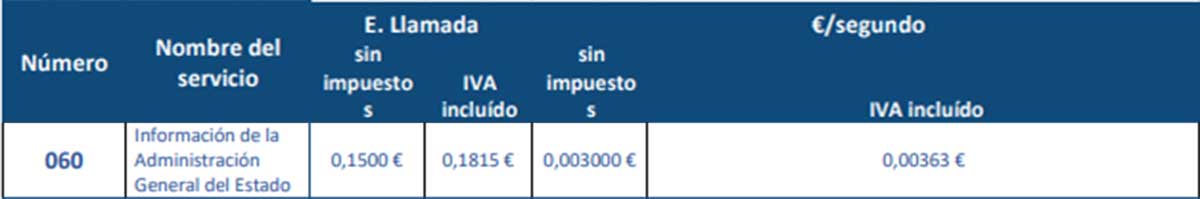 En Movistar el coste del establecimiento de llamada al 060 sin IVA es de 0,1500 euros, mientras que después de impuestos el precio por el establecimiento de llamada es de 0,1815 euros. Cantidad a la que hay que sumarle el coste del precio de la llamada al segundo con IVA incluido, que en esta compañía es de 0,00363 euros.