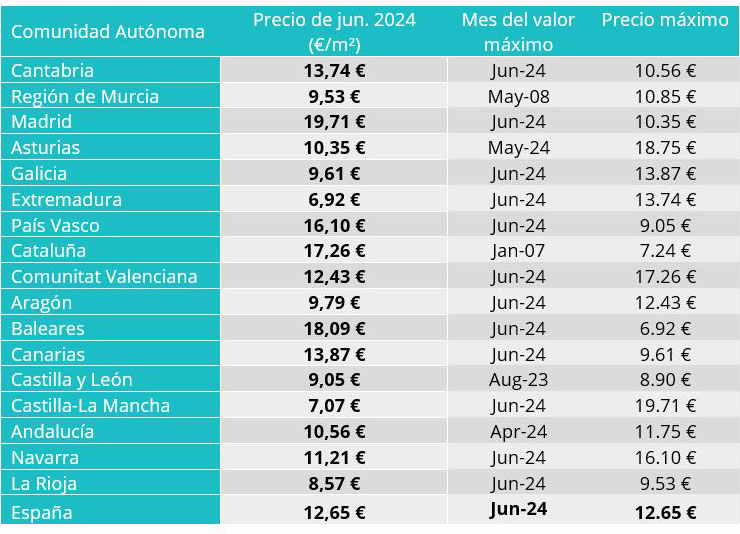 En el caso de las dos comunidades que no han sobrepasado los precios máximos, se prevé que lo hagan en los próximos meses e incluso antes de que acabe el año. De hecho, actualmente Castilla-La Mancha el precio se encuentra a solo un -2,3 % por debajo del precio máximo que se alcanzó en noviembre de 2007 con 7,07 €/m² y en el caso de Aragón, el precio se encuentra un -9,8 % por debajo del máximo que fue en mayo de 2008 con 9,79 €/m².