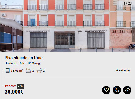En Rute (Córdoba) se vende este piso por 36.000 euros. Se encuentra en la primera planta de un edificio de tres alturas sobre rasante y un sótano bajo rasante, el cual dispone de ascensor. En total, el inmueble posee una superficie total construida de 88,63 m². Las estancias se distribuyen en dos habitaciones, dos baños, salón-comedor y cocina con patio. Cuenta con un trastero en la azotea como anejo.