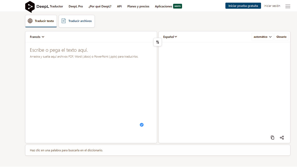 DeepL es otro de los traductores online gratuitos que puedes utilizar para aprender nuevo vocabulario. Con esta herramienta, además de traducir palabras o frases, puedes incluso traducir archivos enteros. Al igual que en el caso anterior, puedes utilizar la traducción del francés al español y viceversa. En la versión gratuita del traductor puedes incluir un máximo de 5.000 caracteres o hasta tres archivos completos por mes.