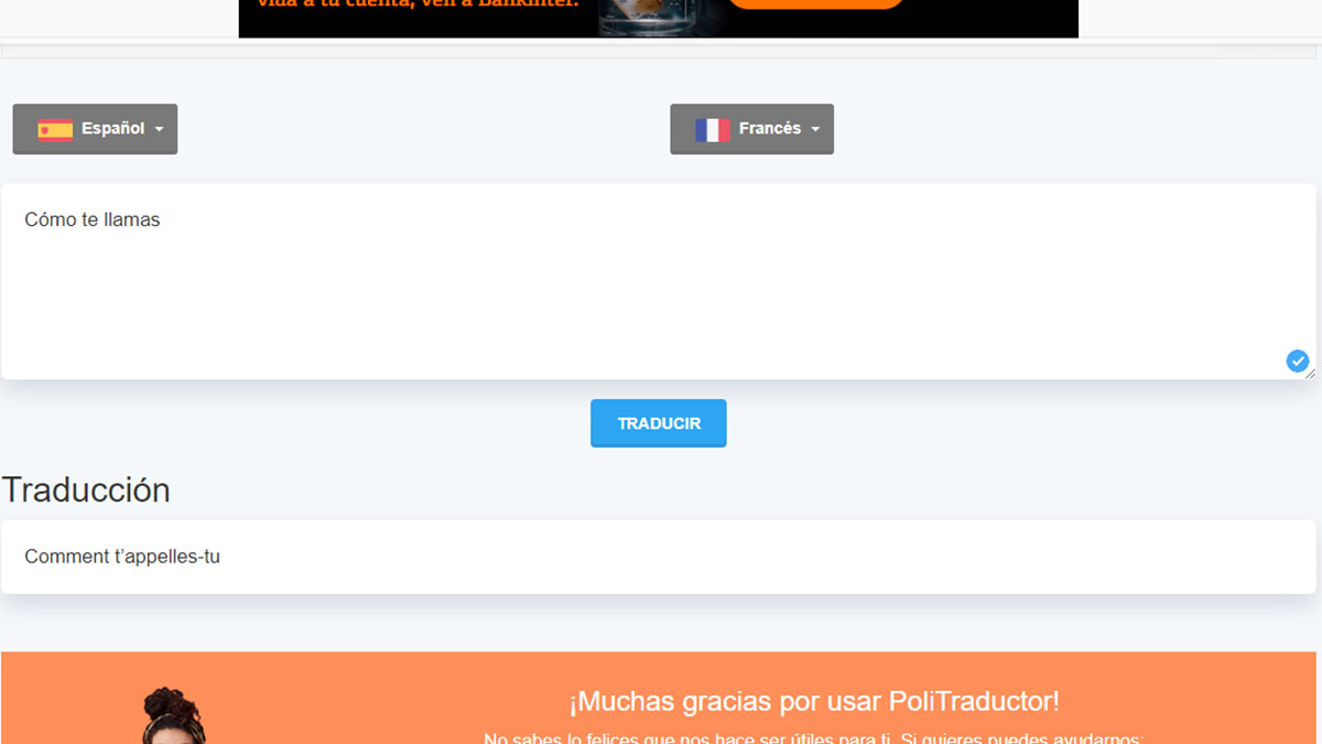 Politraductor es una herramienta con la que puedes buscar traducciones entre el español y el francés entre otros idiomas. Es un traductor de textos gratis, pero limitado a textos cortos. El funcionamiento es muy sencillo. Solamente tienes que seleccionar si quieres escribir la palabra en español o en francés y pulsar el botón azul que dice traducir. Al pulsarlo, aparece un cuadro debajo en el que aparece la frase o palabra traducida.
