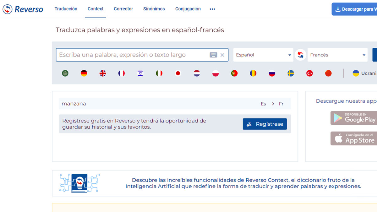 En Reverso también puedes hacer traducciones entre el francés y el español. En este caso puedes consultar palabras, expresiones o textos largos. El funcionamiento es similar a los traductores anteriores. Primero tienes que indicar los idiomas en los que quiere hacer la consulta y después escribir la frase o palabra. Además de traducir la palabra, en este traductor puedes consultar un montón de ejemplos de uso de esa misma palabra en distintos contextos, para ampliar el vocabulario.