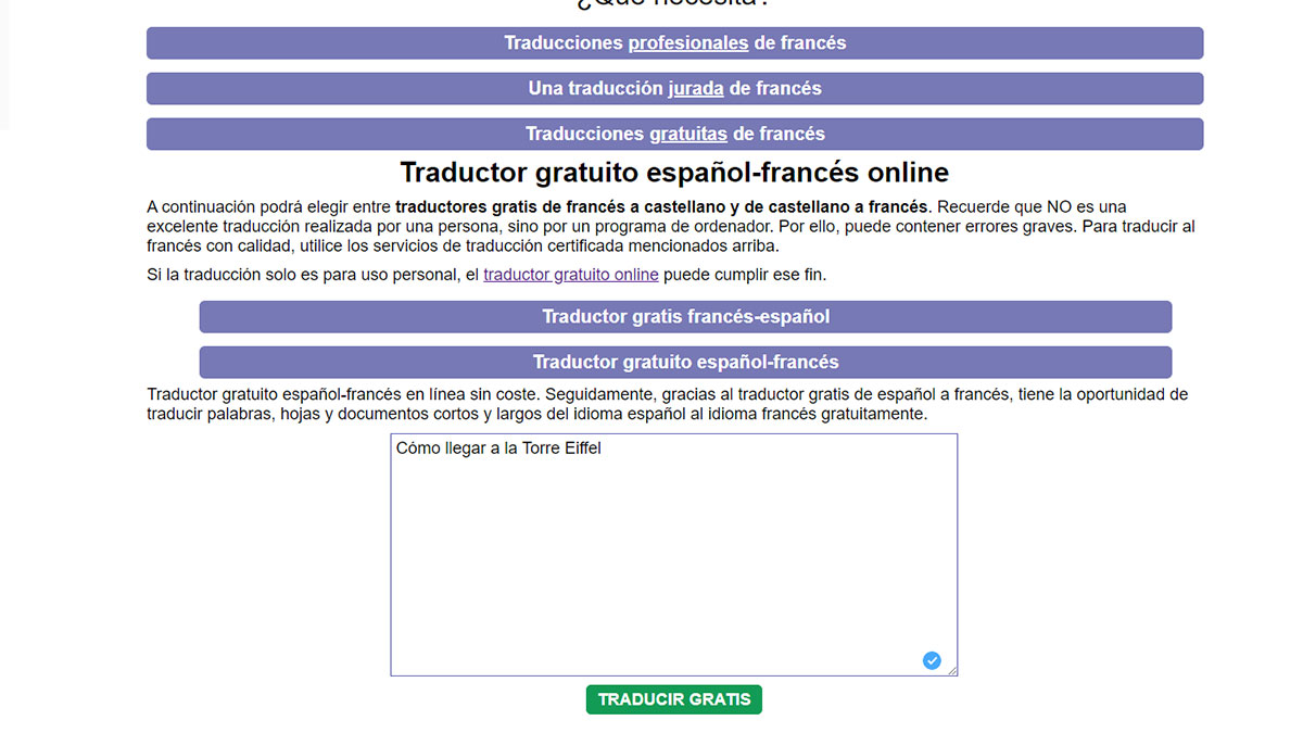 Lostraductores.es cuenta con una sección específica para traducir del francés al español y viceversa. Para usarlo tienes que pulsar sobre el botón morado que se encuentra al final de la página que dice ‘Traducciones gratuitas de francés’. A continuación, seleccionar el botón de la traducción que necesites, del francés al español o viceversa. Al hacerlo, aparece un cuadro en la página en la que puedes escribir la frase que quieres traducir. Al seleccionar una de estas opciones, la página te redirige al traductor de Google.