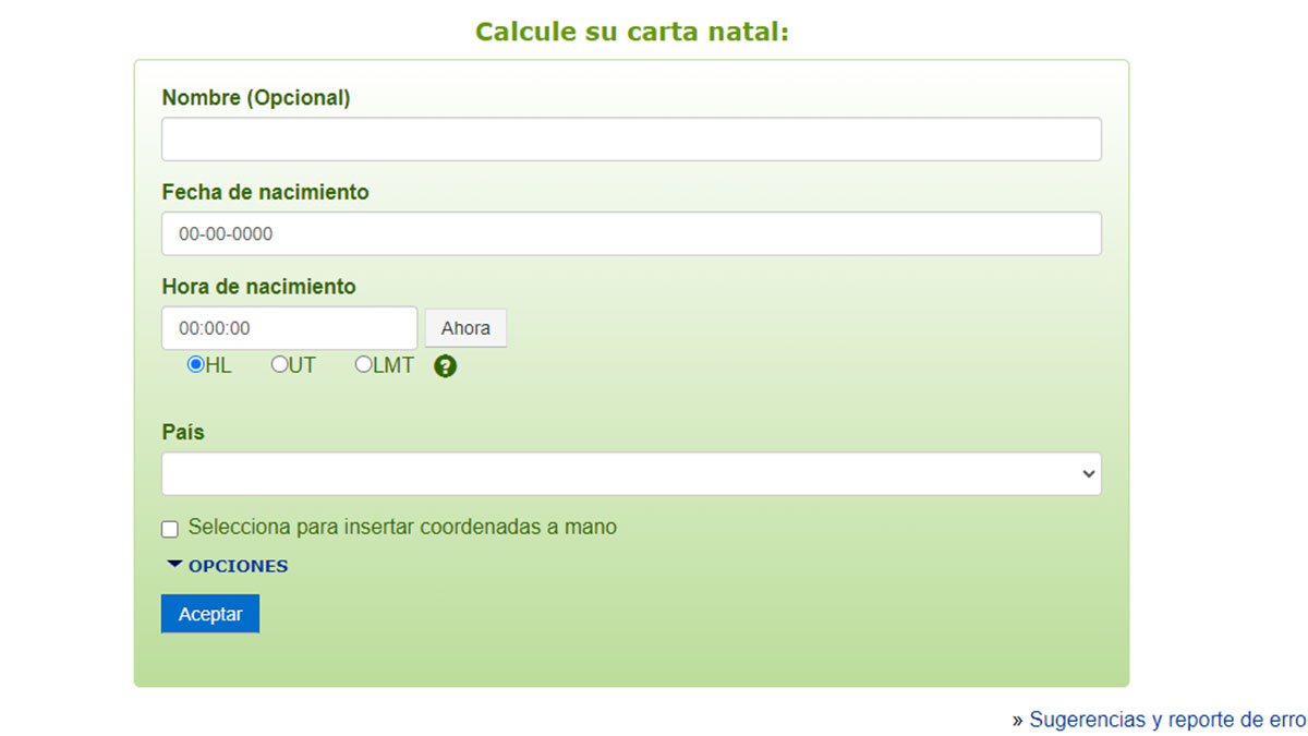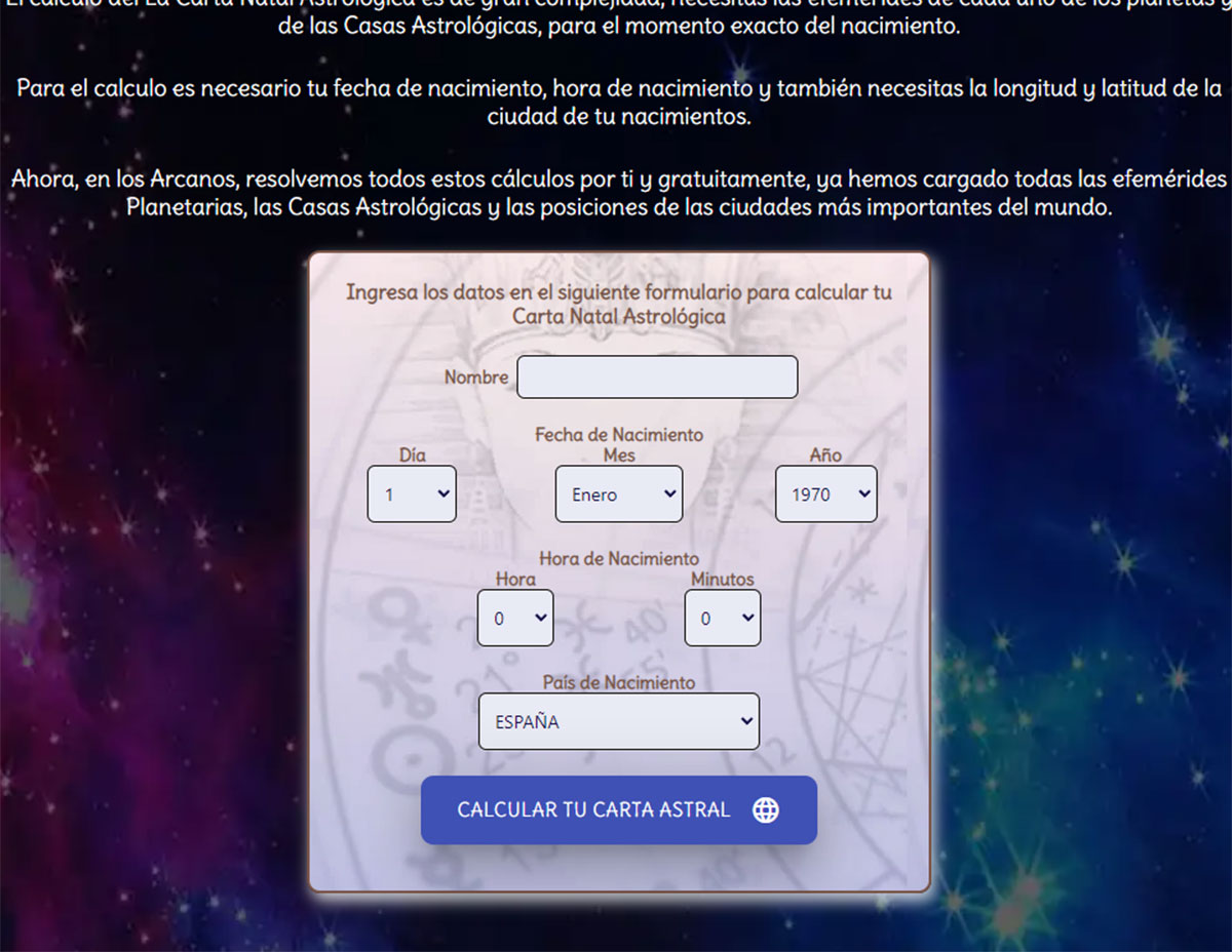 Al hacerlo, se abre una nueva pantalla en la que se explica cómo debe hacerse el cálculo de la carta. Y, a continuación, aparece un formulario que hay que cumplimentar para averiguar qué carta astral se corresponde con cada individuo.