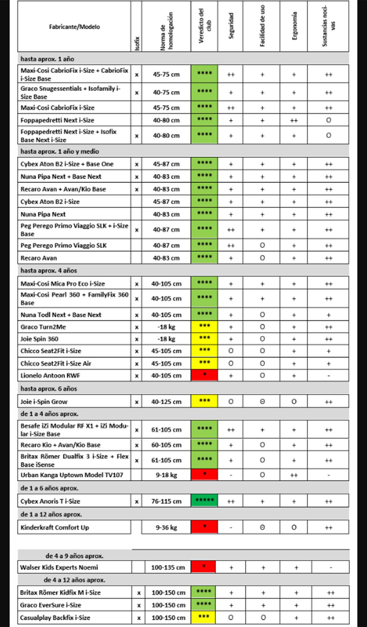 Para conseguir los resultados, se han tenido en cuenta el nivel de riesgo de no saber instalarlo o colocarlo mal, la facilidad de abrochar al niño, que los arneses sean fáciles de poner y quitar y la posibilidad de conversión de la silla o ajuste del tamaño. También han tenido en cuenta en este examen la limpieza y los acabados, así como la claridad de las instrucciones de uso del producto.