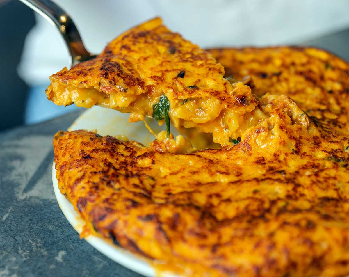 La clásica tortilla de patata con cebolla. Hasta tortilla de patata con topping de chorizo.
