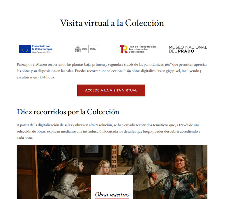 A partir de un proyecto de digitalización en gigapixel financiado con fondos del Plan de Recuperación, Transformación y Resiliencia de España, el Museo del Prado ofrece una visita virtual a toda su colección de cuadros y 10 recorridos temáticos. Todo esto de forma gratuita. En total, puedes recorrer una selección de 89 obras digitalizadas en gigapixel, incluyendo 5 esculturas en 3D-Photo.