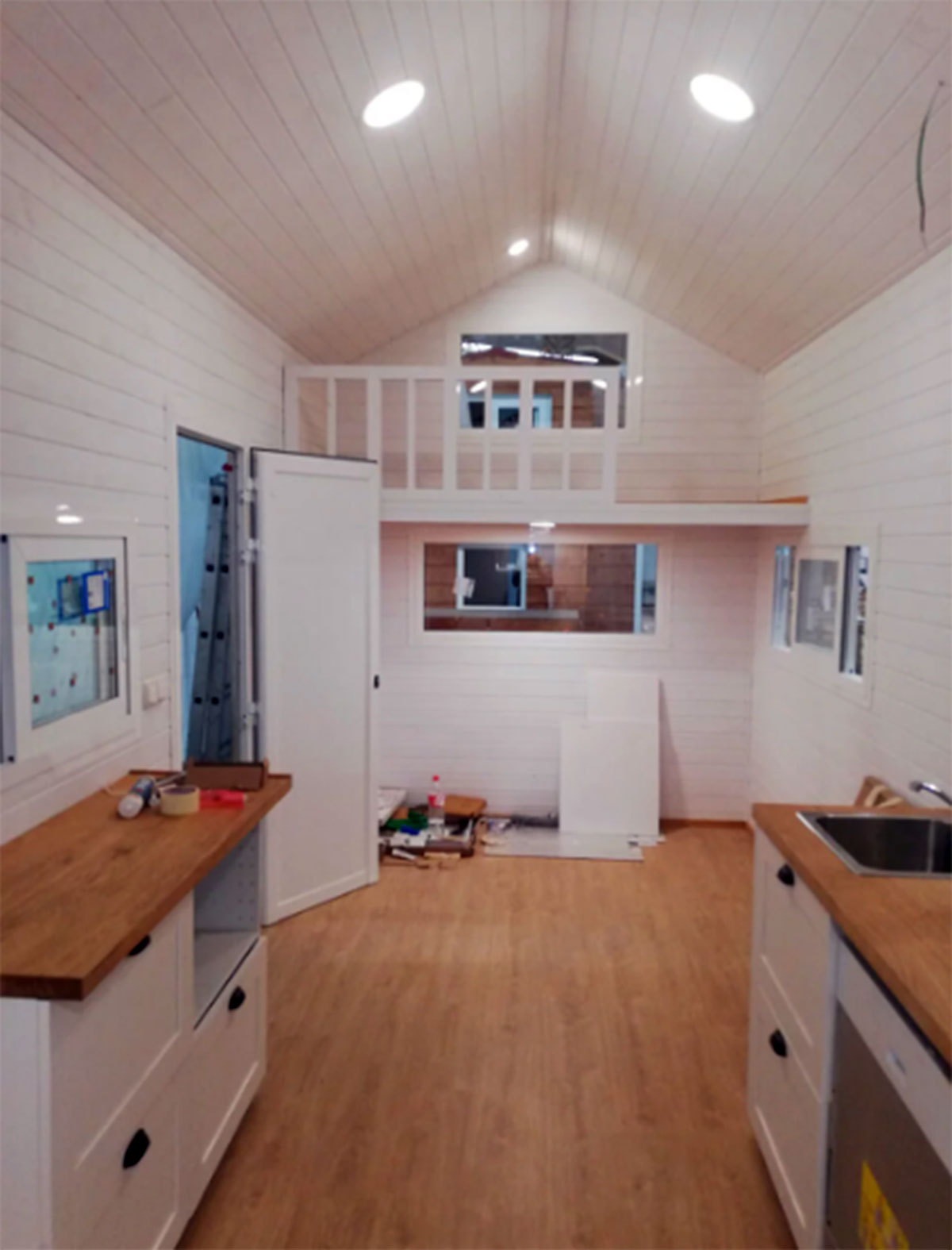 Tiene dos plantas. En la inferior hay un baño, una cocina y un sofá cama para dos personas. Y en la superior hay una cama, un espacio de almacenaje y un armario. Es una casa de 4,6 metros de largo, por 2,5 de ancho y 4 mtros de alto.
