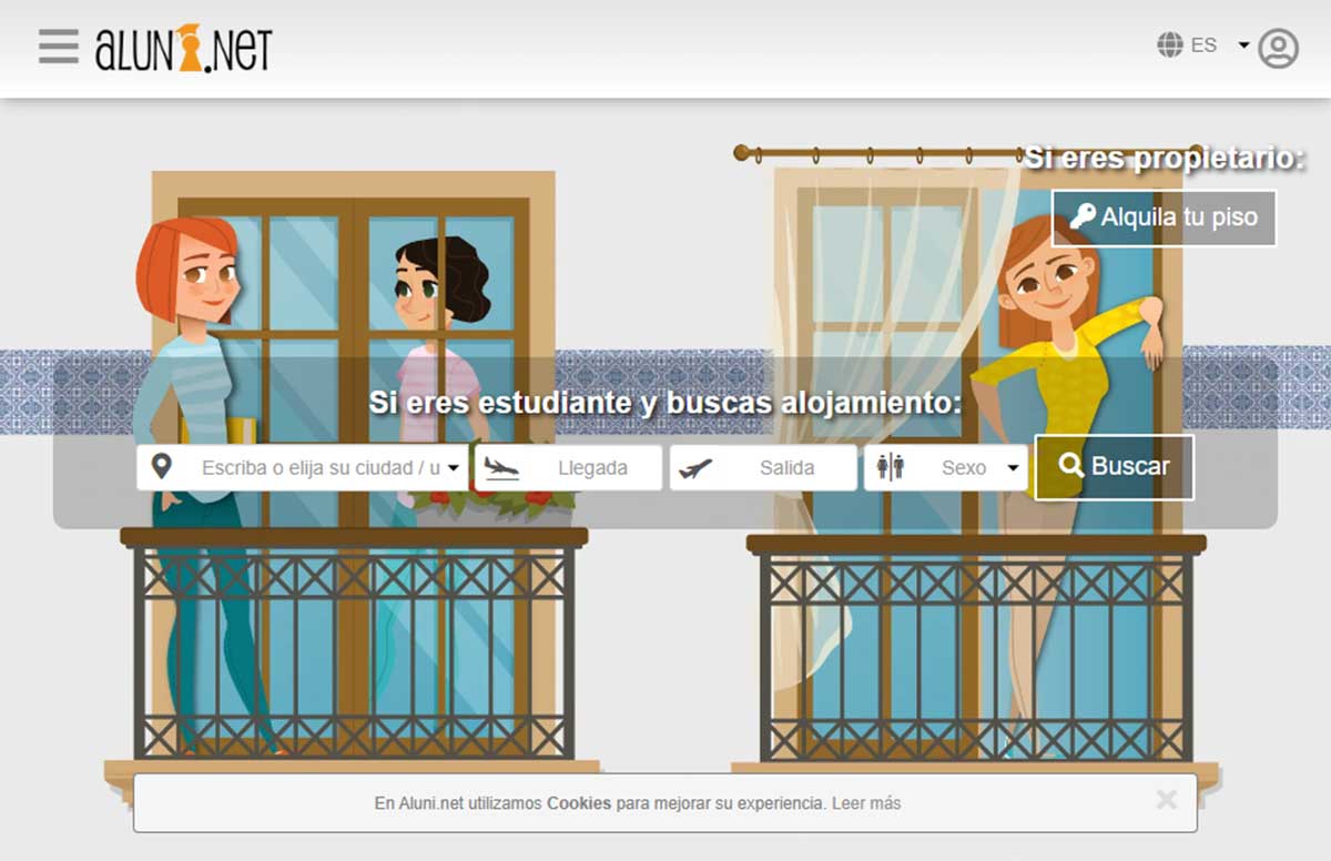 Aluni es otra de las páginas web especializadas en el alquiler de habitaciones. En la home aparece un buscador en el que hay que indicar, si eres estudiante y buscas alojamiento, la ciudad donde quieres instalarte.
