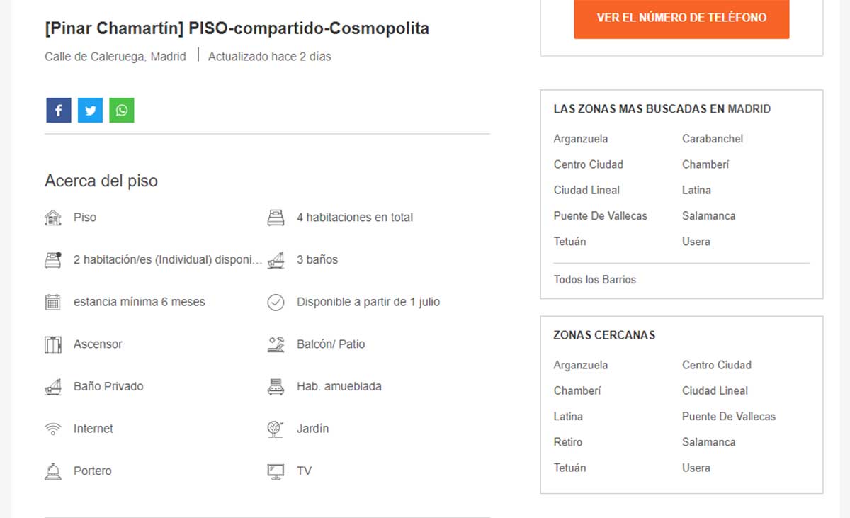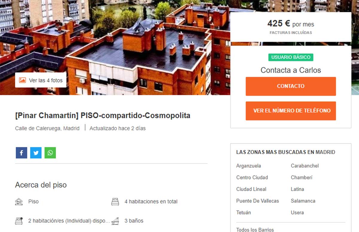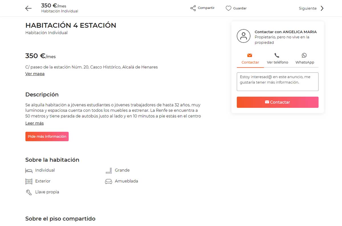 En cada una de estas ofertas, además de la descripción de la habitación y el piso en cuestión, aparecen los datos de contacto del propietario para que las personas interesadas puedan hablar con los dueños de la vivienda.