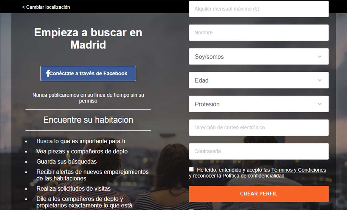Para iniciar la búsqueda solamente hay que indicar el lugar en el que quieres encontrar una habitación y pulsar el botón naranja que dice ‘Buscar’. A continuación, aparece un formulario de contacto en el que hay que cumplimentar los datos personales relativos al nombre, correo, edad y profesión.