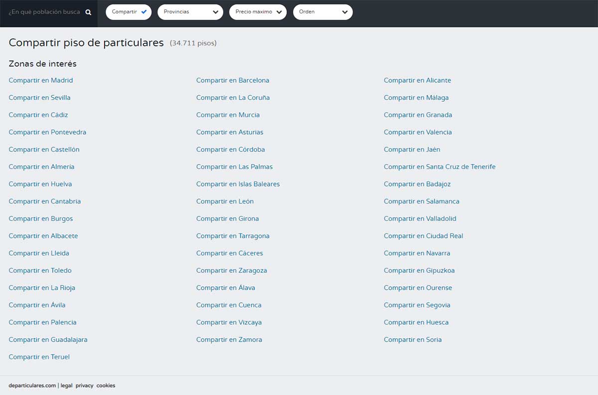 Departiculares es otra de las webs donde puedes encontrar una amplia selección de ofertas de pisos en alquiler. Para localizar la que se ajuste a tus necesidades solamente tienes que acceder a la web oficial y buscar, en la parte inferior de la página, la localidad donde necesitas una habitación.