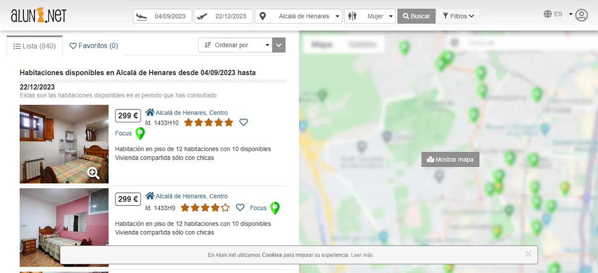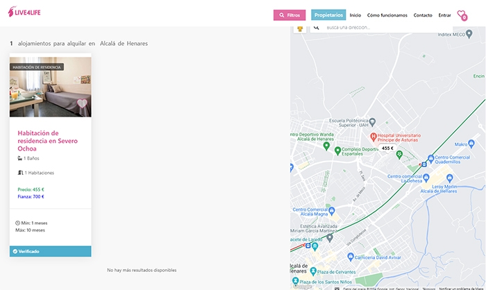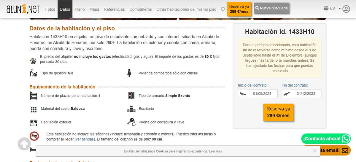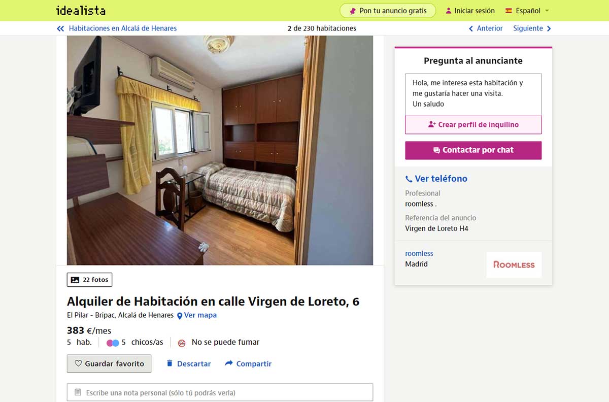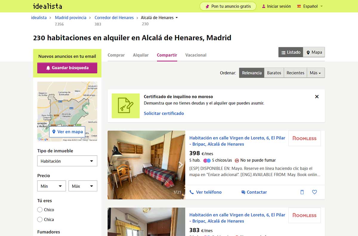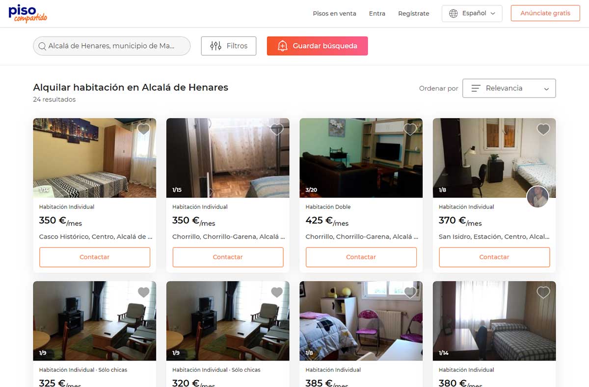 Por ejemplo, si buscas alquilar una habitación en Alcalá de Henares, solo tendrás que introducir el nombre en la barra de búsqueda y aparecerán las ofertas actuales. Al seleccionar un anuncio podrás ver fotos del piso, el precio mensual, las coberturas que incluye e incluso un calendario con los meses que está disponible el alquiler.