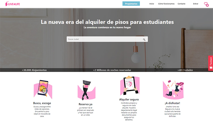 Life4life es un portal web especializado en anuncios de alquileres de pisos compartidos entre jóvenes universitarios. La pantalla principal de la web permite filtrar por ciudad concreta y encontrar la mejor oferta de alquiler de habitación.