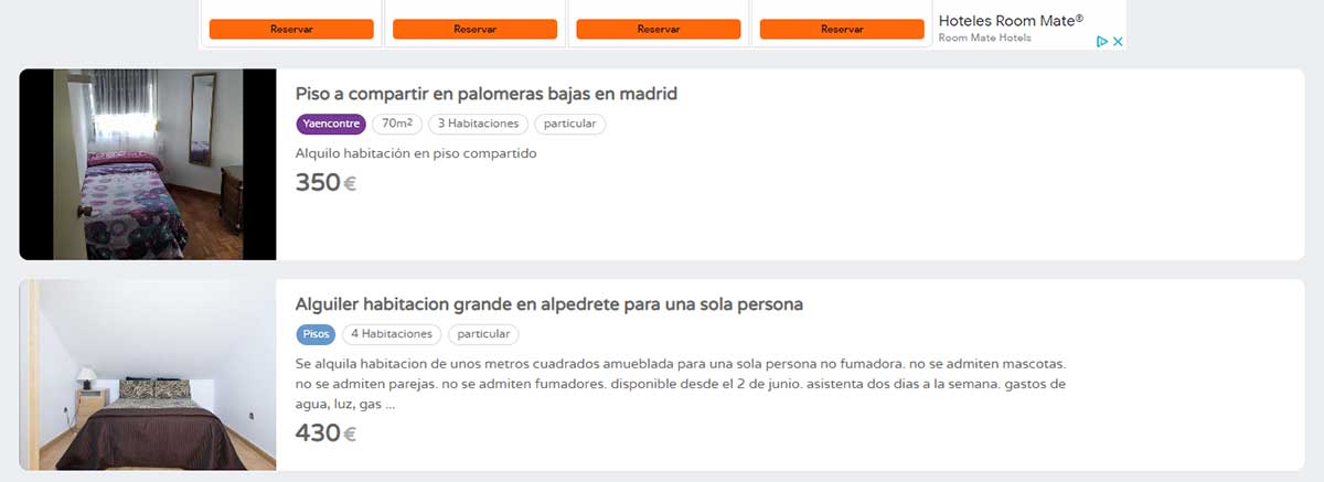 Al pulsar sobre uno de los enlaces aparece una nueva página donde se muestran todos los anuncios de alquiler de habitaciones en la localidad indicada. Si alguna de las ofertas te interesa, en el interior puedes encontrar todos lo detalles al respecto del anuncio. Desde la descripción del inmueble, fotografías, precio, normas de la casa y hasta el perfil del resto de inquilinos del piso compartido.