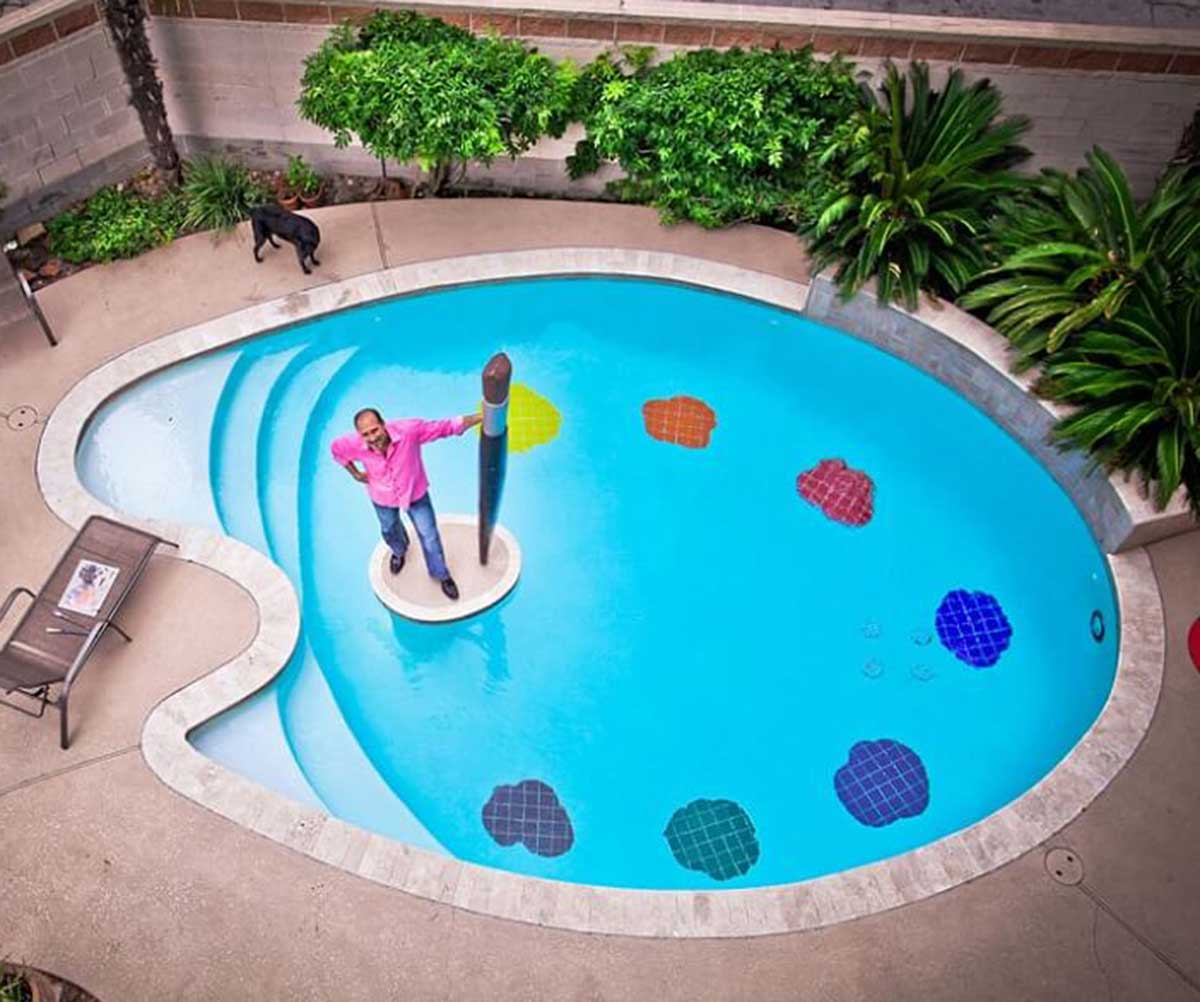 Esta original y colorida piscina es del pintor Allan Rodewald y está ubicada en Houston. Los azulejos del fondo son de colores diferentes, representando una paleta. En el medio está el detalle de una pequeña isla que simula el orificio por donde se mete el dedo para pintar con dicha herramienta.
