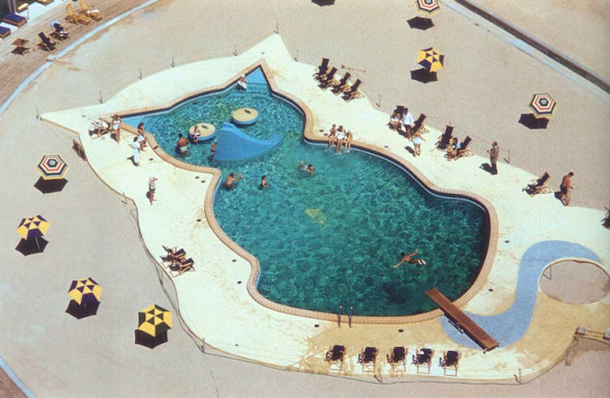 Esta piscina tan divertida hará reír a los niños por su forma de gato. Esta piscina se estrenó en los años 50 y está en el Hotel Fontainebleau en Miami.