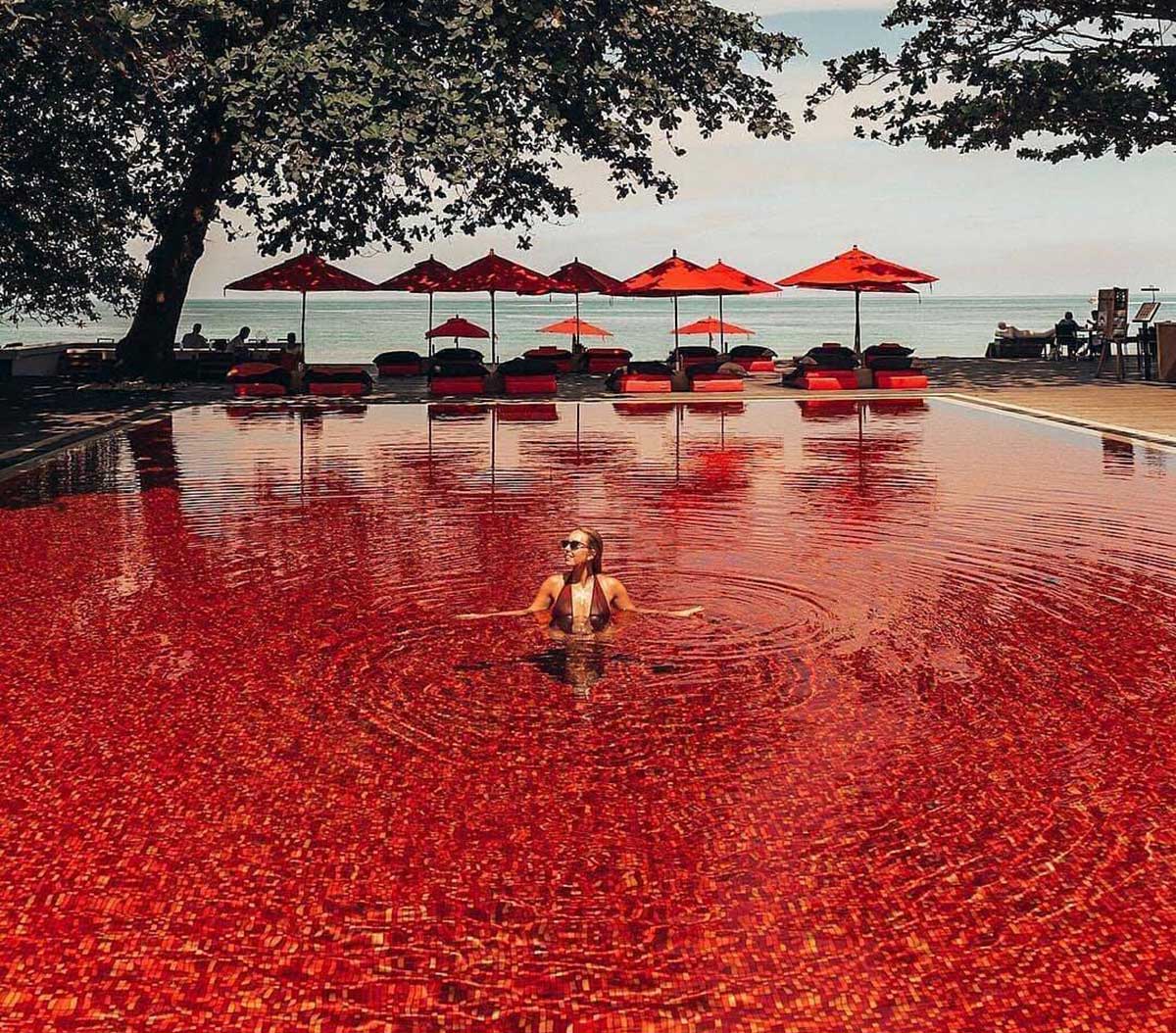 Esta extraña piscina está ubicada en un hotel de Tailandia. The Library, nombre que recibe la pileta, tiene este color rojizo debido a los azulejos de los que está compuesta, con una combinación de naranja, amarillo y rojo que simulan una piscina de sangre.